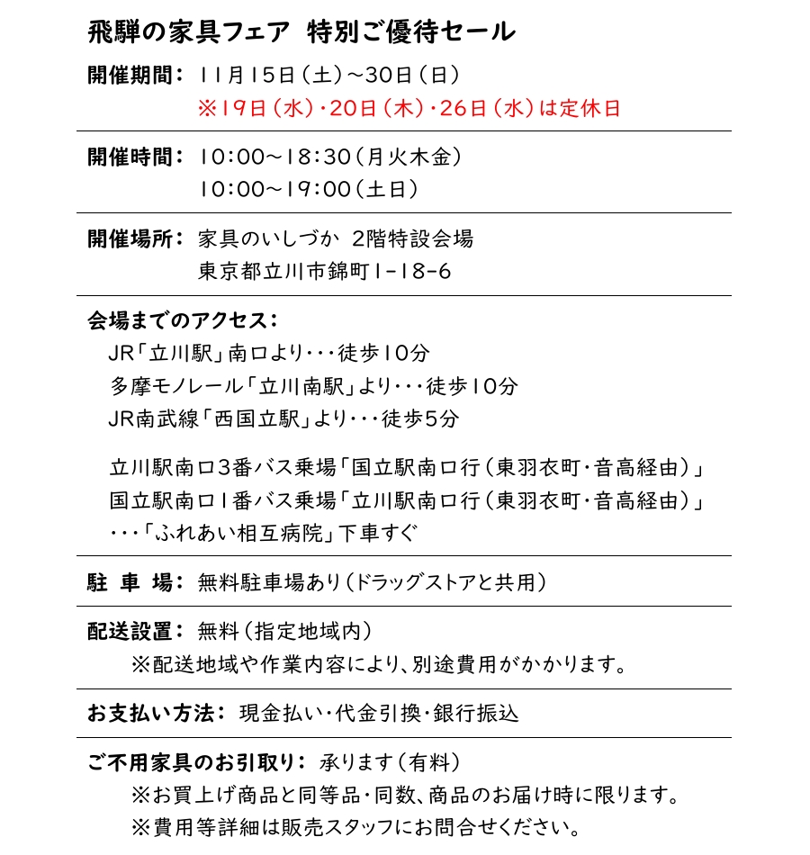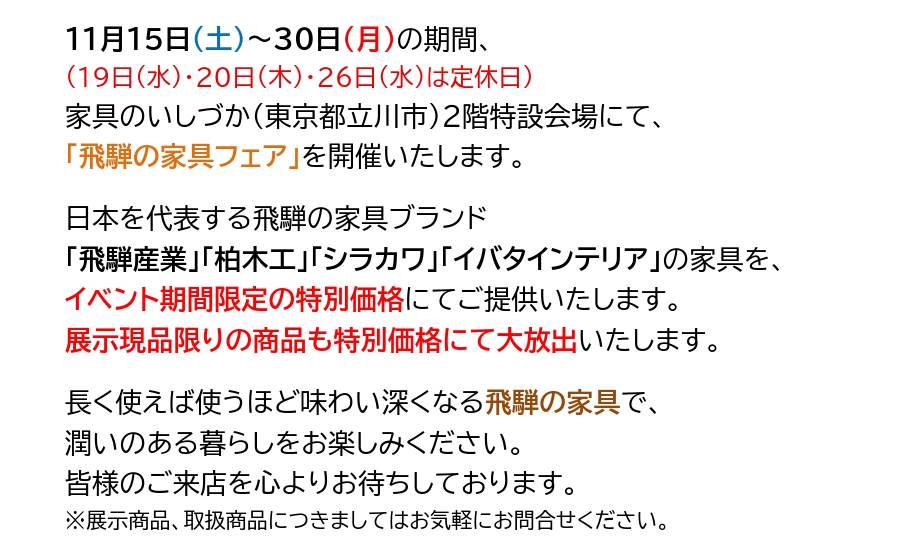 11月15日~30日「飛騨の家具フェア 特別ご優待セール」