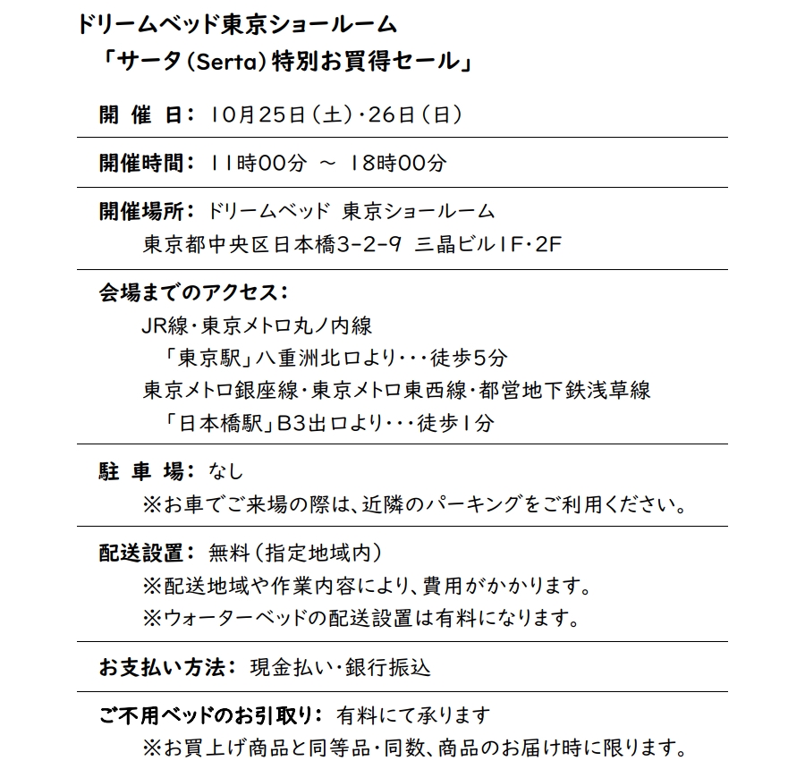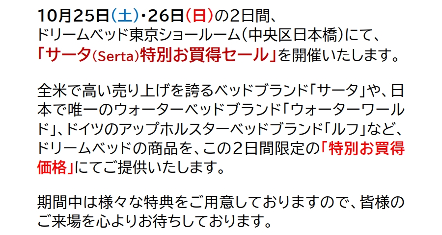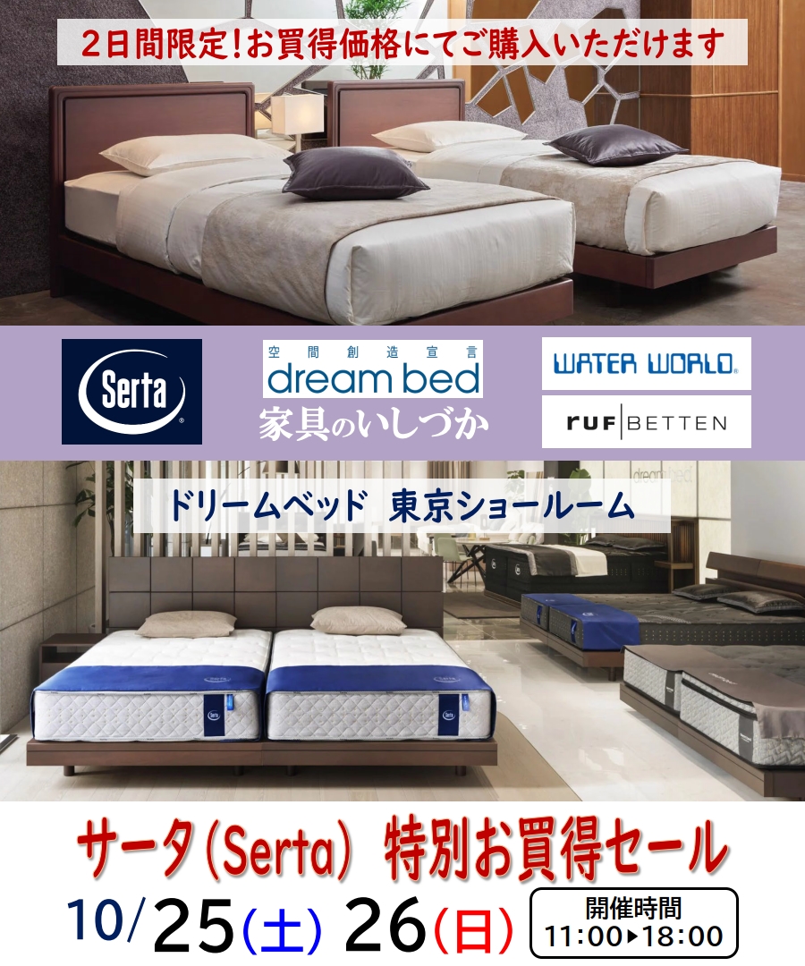 10月25日・26日「ドリームベッド東京ショールーム サータ特別お買得セール」
