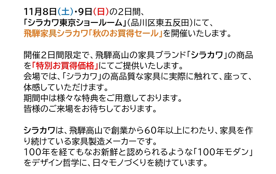 11月8日・9日「飛騨家具シラカワ 秋のお買得セール」