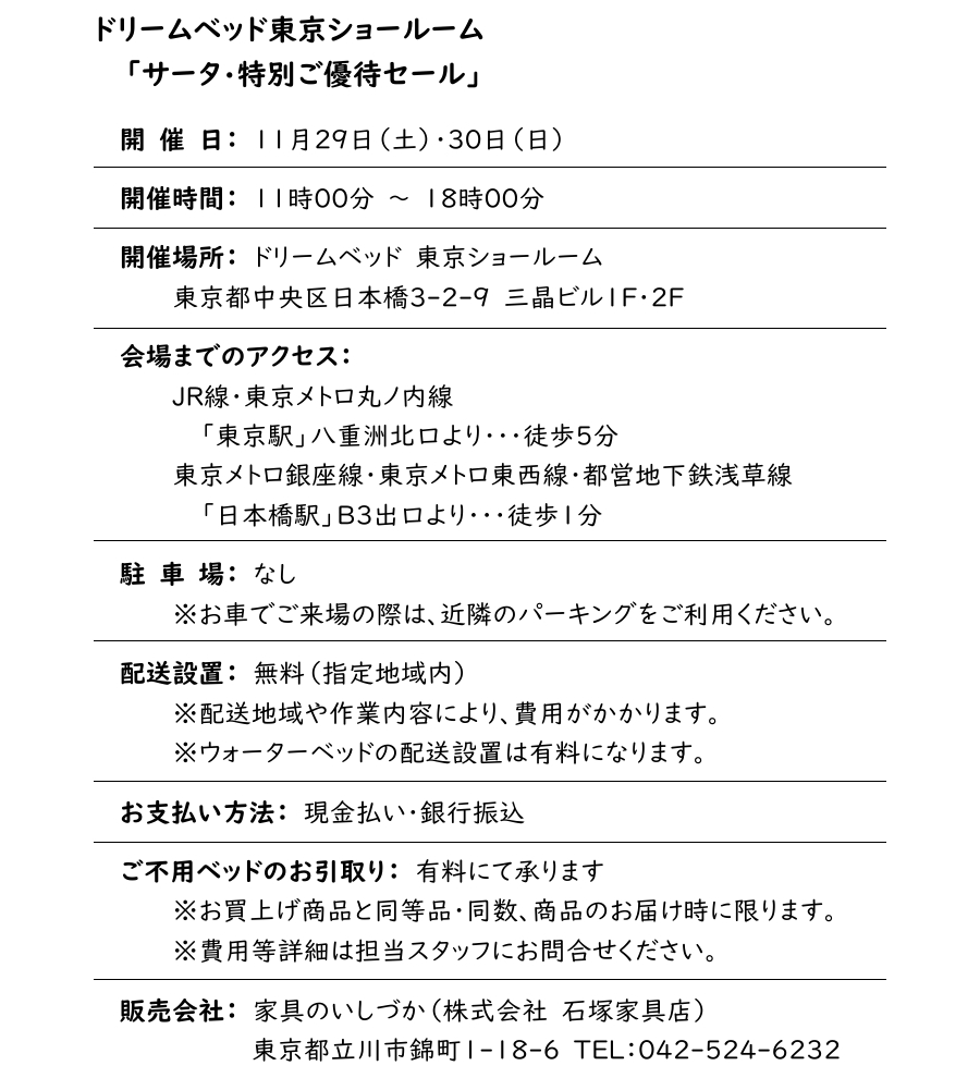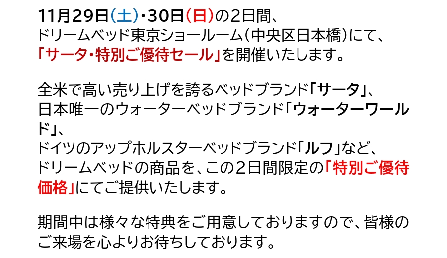 11月29日・30日「ドリームベッド サータ・特別ご優待セール」